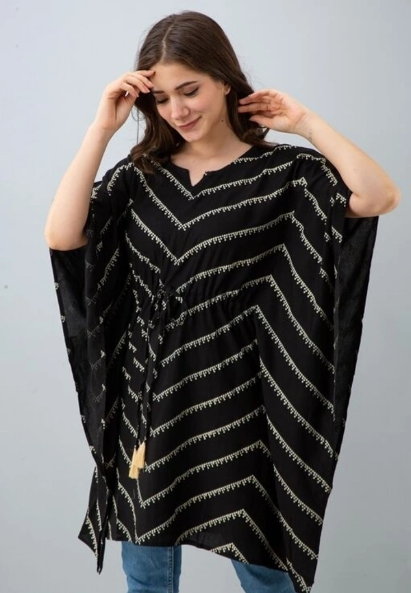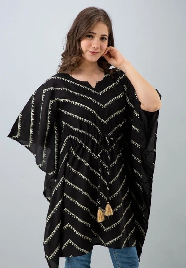 Fabric: Rayon Sleeve Length: Three-Quarter Sleeves Pattern: Printed Multipack: 1 Sizes: S (Bust Size: 38 in, Length Size: 34 in) XL (Bust Size: 44 in, Length Size: 34 in) L (Bust Size: 42 in, Length Size: 34 in) M (Bust Size: 40 in, Length Size: 34 in) XXL (Bust Size: 46 in, Length Size: 34 in) Charvy Comfy Rani Lehriya Printed Rayon Kaftan